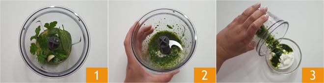 Para preparar la ensalada de atún comienza con el aderezo: en una batidora coloca las hojas de albahaca, menta y perejil, el diente de ajo pelado, el aceite, una pizca de sal 1 y mezcla todo 2. Aromatiza con la salsa aromática el yogur griego 3.
