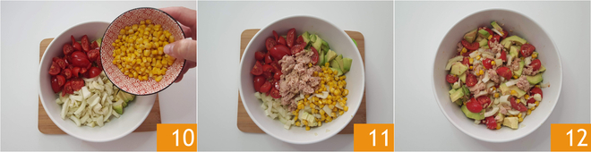 Reúne todos los ingredientes en un bol 10 añade también el maíz 10 y el atún 11, sala, pimienta y mezcla 12. Acompaña la ensalada de atún con la salsa de yogur.