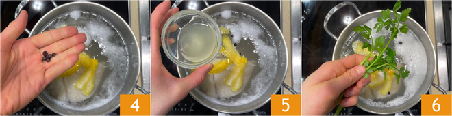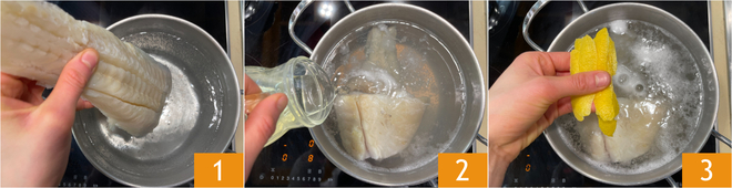 Para preparar la ensalada de bacalao, primero lleva a ebullición una olla llena de agua e introduce el filete de bacalao entero 1. Añade el vino blanco 2 y la cáscara de limón 3.