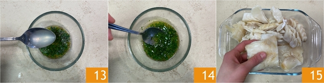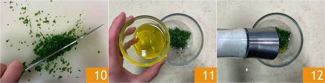 Pasa a la salsa de perejil: pica finamente el perejil 10, luego transfiérelo a un bol pequeño y añade el aceite 11, la sal 12 y la pimienta.