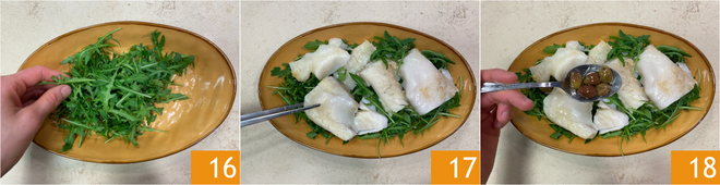 Estás listo para ensamblar la ensalada: distribuye una cama de rúcula en el plato para servir 16, luego coloca el bacalao encima 17 y distribuye las aceitunas taggiasche 18.