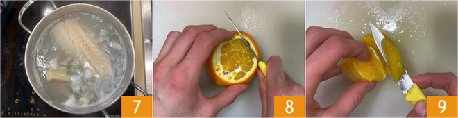 Cocina durante unos 35 minutos 7. Mientras tanto, pela las naranjas en vivo eliminando la cáscara 8 y extrayendo la pulpa en gajos, sin la parte blanca 9.