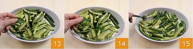 Añade entonces las hojas de menta trituradas 13 y las hojas de albahaca 14. Mezcla todo con un tenedor 15 o una cuchara y tu ensalada de calabacines con menta y albahaca está lista para ser servida y consumida, tanto tibia como fría. Si no la sirves de inmediato, mantenla en la nevera hasta el momento de consumirla.