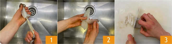 Para preparar la ensalada de calamares y patatas, comenzad por limpiar los calamares: separad delicadamente la cabeza del cuerpo 1, eliminad las entrañas y la pluma transparente, retirad la piel exterior y las aletas laterales 2. Cortad la parte del pico y enjuagad bien los calamares bajo agua corriente, luego cortadlos en anillos 3. Cortad también en trozos la parte de los tentáculos.