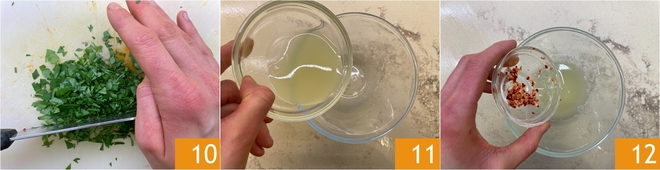 Picad finamente también el perejil 10. En un pequeño bol preparad la vinagreta: verted el zumo de limón 11 y añadid el picado de ajo y guindilla 12.