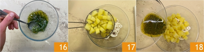 Mezclad para emulsionar bien la salsa 16. Tan pronto como las patatas estén cocidas, escurridlas bien y trasladadlas al bol con los calamares 17. Verted también la vinagreta 18.
