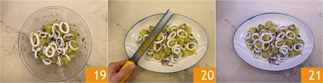 Mezclad bien todo para sazonar 19, luego emplatar y decorad con ralladura de limón 20. La ensalada de calamares y patatas está lista para servir 21.