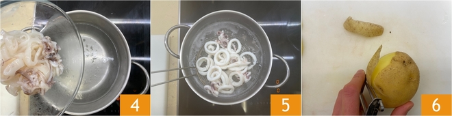 Poned a hervir una olla con agua ligeramente salada, sumergid los calamares 4 y cocedlos durante unos 3 minutos, luego escurridlos bien 5 y reservadlos en un bol. Mientras tanto, pelad las patatas 6.