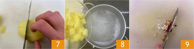 Cortadlas en cubos de 3 cm 7 y sumergidlas en la misma agua de cocción de los calamares 8. Cocedlas durante 10 minutos o hasta que estén tiernas pero aún compactas, luego escurridlas y dejadlas templarse. Preparad ahora un picado fino de ajo y guindilla 9.