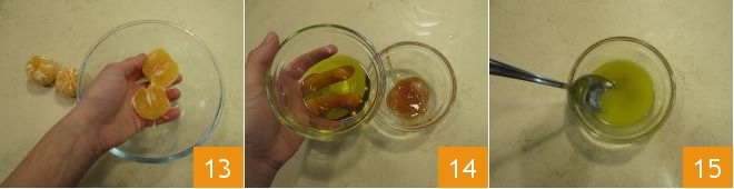 Retira los gajos en un bol cuidando de quitar todas las partes blancas 13 y para terminar prepara el aderezo. En un bol vierte la miel y el aceite 14. Bate rápidamente añadiendo la sal y forma así una emulsión 15.
