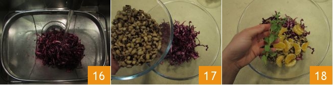 Ahora que ya tienes todo listo, pasa a la composición. Escurre la col lombarda de la marinada y enjuágala 16, ponla en un bol junto con los frijoles 17, los gajos de mandarina, la mejorana fresca deshojada 18.