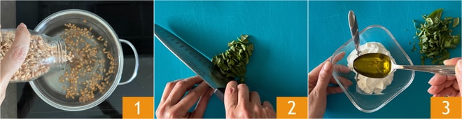 Para preparar la ensalada de espelta fría, lleva a ebullición en una olla agua ligeramente salada y cuece la espelta 1 durante el tiempo indicado en el paquete. Lava y pica las hojas de albahaca 2, vierte el yogur en un cuenco pequeño, añade una pizca de sal y una cucharada de aceite 3.
