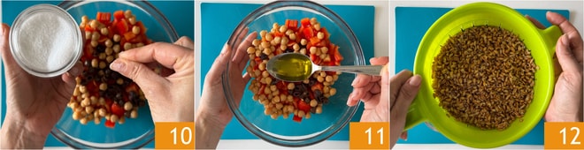Condimenta todo con una pizca de sal 10 y 2 cucharadas de aceite 11 y mezcla bien. Escurre la espelta 12 y pásala bajo el agua corriente para interrumpir la cocción.