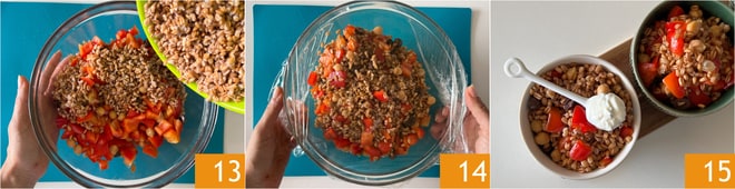 Añade la espelta a las verduras 13, mezcla bien. Cubre el cuenco con film transparente 14 y luego enfría en el frigorífico por al menos una hora. Distribuye la ensalada de espelta fría en cuencos individuales y sirve acompañando con una cucharada de salsa de yogur y albahaca 15.