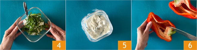 Sazona con las hojas de albahaca troceadas 4. Mezcla bien, cubre el cuenco con un trozo de film transparente 5 y ponlo en el frigorífico. Mientras tanto, lava el pimiento, córtalo en 2 y quítale el tallo, los filamentos y las semillas 6.