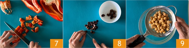 Corta en dados pequeños 7 y ponlos en un cuenco. Corta por la mitad las aceitunas 8 y únelas a los pimientos. Escurre los garbanzos 9 y añádelos a los pimientos.
