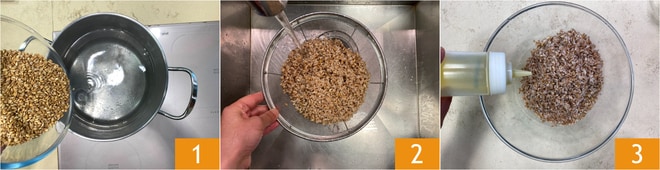Para preparar la ensalada de farro con pesto de hierbas y primosale poned a hervir el farro 1 (este instantáneo estará listo en unos 12 minutos), sal al final de la cocción. Escurrid y enjuagad con agua fría 2, verted en un bol y condimentad con un chorro de aceite 3.