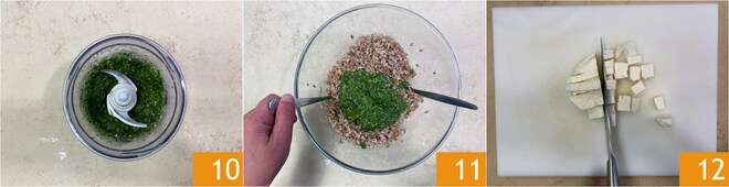 Accionad las cuchillas para mezclar todo 10. Verted el pesto en el farro 11 y mezclad. Cortad el primosale en cubos 12.