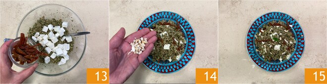Incorporad los tomates secos cortados en tiras y el primosale 13. Decorad con los anacardos ligeramente triturados 14. La ensalada de farro está lista para ser disfrutada 15.
