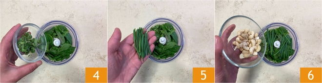 Preparad el pesto vertiendo en el bol de la batidora la albahaca, la mejorana 4, el cebollino 5 y los anacardos 6.