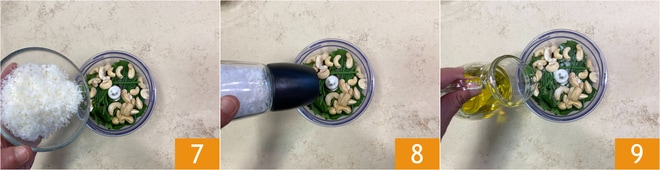 Añadid el Pecorino 7, sal 8 y verted el aceite 9.