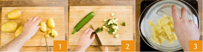 Para preparar la ensalada de patatas y calabacines, comienza con las verduras. Limpia las patatas y córtalas en trozos de un par de centímetros 1, corta los extremos y corta los calabacines al mismo tamaño 2. En una vaporera, cocina las patatas durante unos diez minutos 3