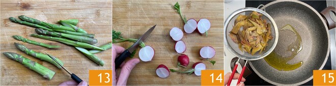 Recortar los tallos de los espárragos, luego cortarlos en diagonal 13. Lavar y dividir por la mitad los rábanos 14. Finalmente, cortar en rodajas las alcachofas limpias y verterlas en una sartén grande con un chorro de aceite caliente 15.