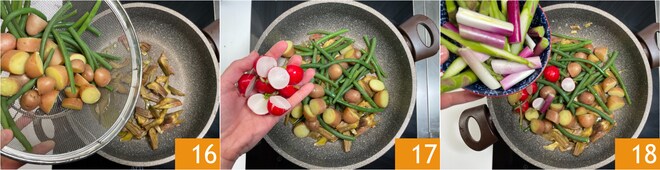 Unir las patatas con las judías verdes 16, los rábanos 17, los espárragos y las cebolletas 18.