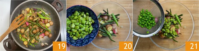 Saltear y cocinar a fuego alto durante unos 10 minutos, sin remover con frecuencia para que se forme una costra dorada 19. Una vez cocidas, transferir las verduras a un bol, luego agregar las habas 20 y los guisantes escaldados 21.