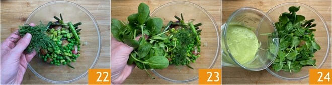 Unir el eneldo 22 y las espinacas, lavadas y secas 23, luego verter la crema de guisantes 24.