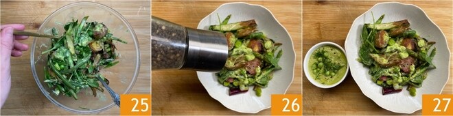 Mezclar para incorporar bien el aliño a las verduras 25 y completar con una molienda de pimienta 26. ¡Tu ensalada de primavera está lista para servir 27!