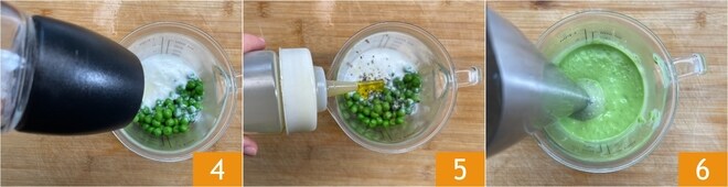 Condimentar con sal 4, pimienta y aceite 5, luego batir con una batidora de inmersión hasta obtener una consistencia cremosa 6. Reservar la salsa obtenida.