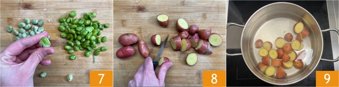 Escaldar también las habas durante 5 minutos en agua hirviendo con sal, luego escurrir y dejar enfriar un poco; quitar la piel exterior y reservar 7. Lavar bien las patatas y cortarlas en 2 o 3 partes, según el tamaño, sin quitar la piel 8. Poner las patatas en una olla con agua fría con sal, llevar a ebullición y dejar cocer desde ese momento durante 8 minutos 9.