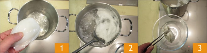 Para preparar la ensalada de sepia, lleva a hervir el agua en una cacerola grande. A continuación, baja el fuego y añade las sepias ya limpias 1. Cocina a fuego medio-alto durante 15 minutos: la cocción depende del tamaño de las sepias. Escurre las sepias 2 y déjalas enfriar en un bol 3, cubre con film transparente o con un plato.