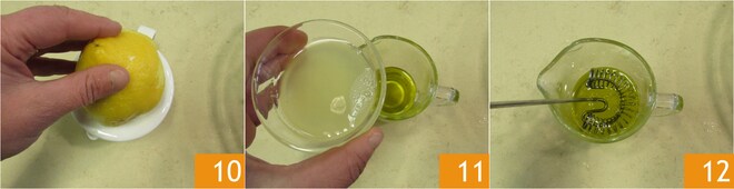 Exprime el zumo de limón 10, agrégalo al aceite 11 y mezcla para crear una vinagreta de limón fluida y bien amalgamada 12.