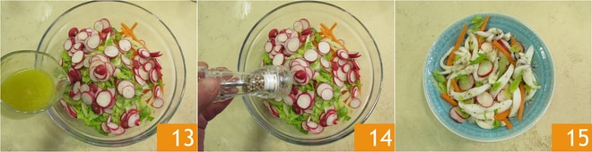 Vierte el aliño sobre la ensalada de sepia, sazona al gusto con sal y pimienta 14, mezcla y sirve de inmediato!