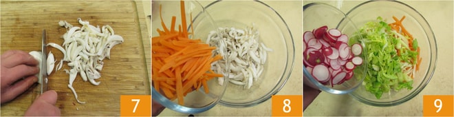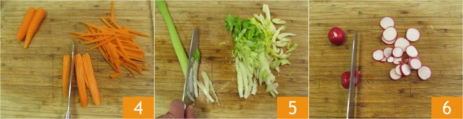 Mientras tanto, lava las verduras. Pela las zanahorias y córtalas en tiras de aproximadamente 5 mm de grosor y 4-5 cm de longitud 4. Corta finamente el apio con sus hojas más o menos del mismo tamaño y resérvalo 5. Corta los rábanos en rodajas finas 6.
