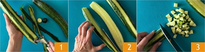Para realizar la ensalada Shirazi, primero prepara las verduras: corta los extremos de los pepinos, luego pélalos en tiras alternas con un pelador 1. Divídelos por la mitad a lo largo 2 y elimina las semillas centrales, luego córtalos en cubos bastante pequeños 3.
