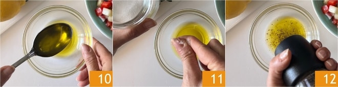 Pasa al aderezo: vierte el aceite en un tazón pequeño 10, añade sal 11 y pimienta 12.