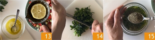 Agrega el jugo de limón 13, luego pica el perejil y la albahaca 14. Añade las hierbas picadas y la menta seca 15 y emulsiona todo.