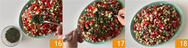 Distribuye el aderezo sobre la ensalada 16 y mezcla bien 17. La ensalada Shirazi está lista para ser servida 18!