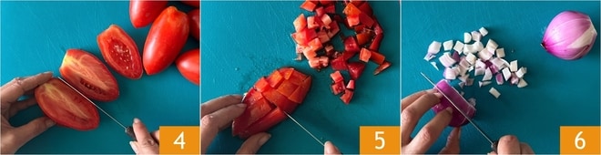 Divide los tomates por la mitad también 4 y córtalos en cubos después de eliminar las semillas 5. Limpia y corta en cubos también la cebolla 6.