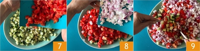 Transfiere los pepinos a un plato de servir junto con los tomates 7 y las cebollas 8, luego mezcla bien 9.