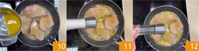 Dorad las lonchas también por el otro lado durante 1-2 minutos, luego verted el zumo de naranja 10. Ajustad de sal 11 y de pimienta 12.