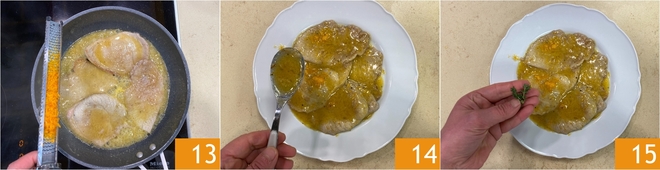 Añadid la mayor parte de la cáscara de naranja rallada 13; mezclad bien para disolver el fondo de cocción y volved a girar las lonchas un par de veces para que se impregnen de sabor. Continuad la cocción a fuego lento durante unos minutos, hasta que el fondo se espese y se vuelva cremoso; en total llevará unos 8 minutos. En este punto solo queda emplatar vuestras escalopas a la naranja: transferidlas a un plato de servir, añadid la salsita 14 y algunas hojitas de tomillo 15.