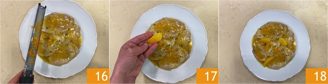 Terminad con un poco de la cáscara de naranja reservada 16, los gajos al vivo 17 y servid vuestras escalopas a la naranja bien calientes 18!