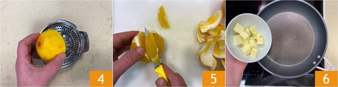 Exprimid una de las naranjas 4: debéis obtener aproximadamente 80 g de zumo. Pelad al vivo la naranja restante y separad los gajos ayudándoos con un cuchillito 5. Verted la mantequilla en una sartén grande 6 y dejad que se derrita a fuego lento.