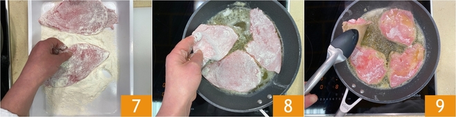 Mientras tanto enharinad las lonchas de carne una a una, eliminando el exceso de harina sacudiéndolas ligeramente 7. Cuando la mantequilla esté completamente derretida, subid ligeramente el fuego y colocad las lonchas en la sartén 8. Dejad que se doren durante 1-2 minutos, luego dales la vuelta 9.