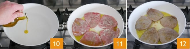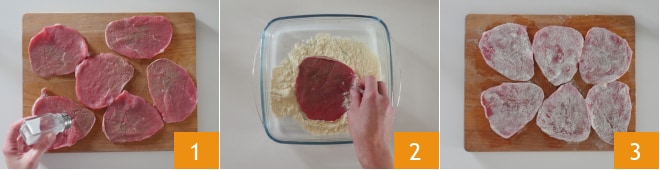 Para preparar los escalopines al gorgonzola, primero salar las lonchas de carne 1 masajeándolas con los dedos, luego pasarlas por la harina 2 y colocarlas en una tabla de cortar 3.