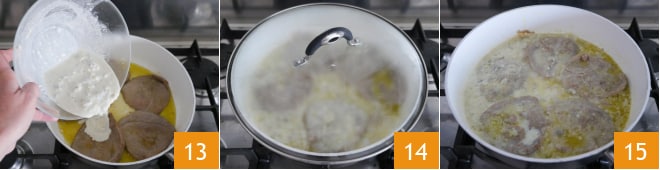 Añadir el gorgonzola con la leche 13, cubrir con la tapa 14, bajar el fuego y cocinar durante 5 minutos, dando la vuelta a las lonchas de carne a mitad de cocción. Retirar la tapa, dejar espesar la salsa y apagar el fuego 15.